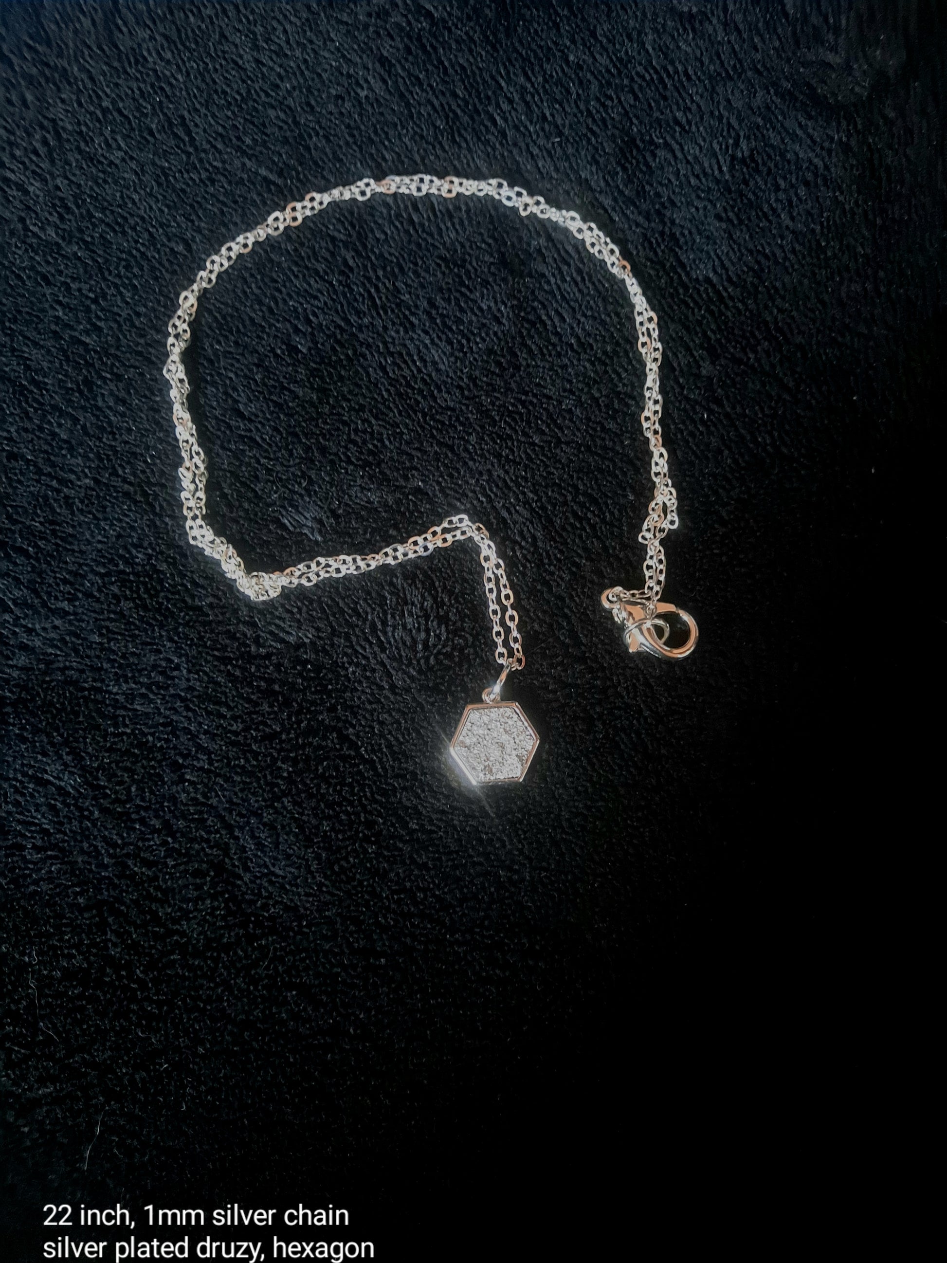 22 inch, 1mm silver chain silver plated druzy, hexagon.